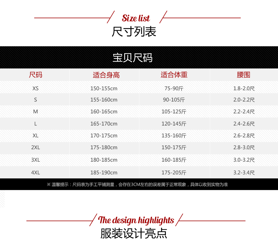 - 本產品共8個尺碼:XS、S、M、L、XL、2XL、3XL、4XL 覆蓋99.5%的人群 >>>查看尺碼表>